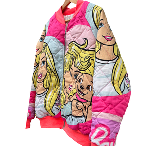 Deze kleurrijke bomberjas is met de hand gemaakt van een vintage Barbie deken. Een echte one of a kind!