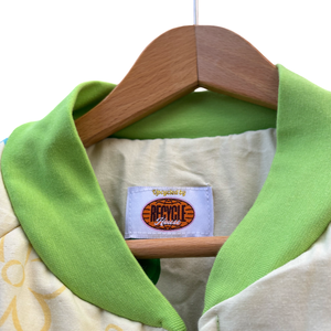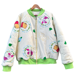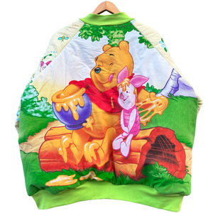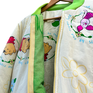 Uniek handgemaakt bomberjack, gemaakt van een tweedehands Winnie the Pooh dekbed. Dit item is volledig upcycled en duurzaam geproduceerd. De tussenvoering bestaat uit een hergebruikte deken die professioneel is gestoomd en gereinigd, wat zorgt voor comfort en warmte.