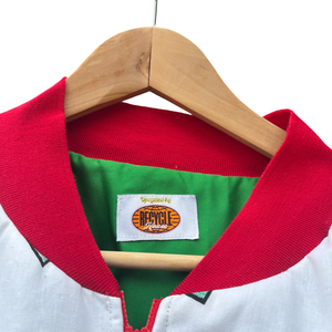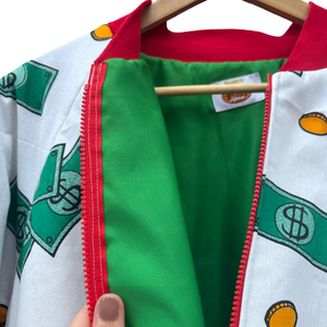 Deze handgemaakte bomber is volledig gemaakt van tweedehands materialen, waaronder een gerecycled dekbed en hergebruikte fournituren. De rand van Dagobert Duck is met de hand geborduurd, wat dezd jas een uniek karakter geeft. De fit valt als een ruime maat L.
