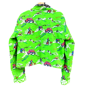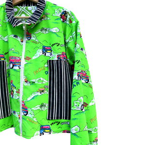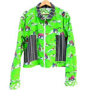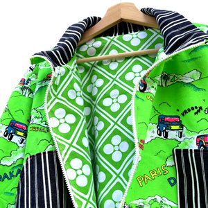Uniek en speels: dit handgemaakte jacket is gemaakt van vintage textiel met een kleurrijke Paris-Dakar print. Het felle groen in combinatie met de stripachtige race-auto’s en motoren geeft de jas een echte retro uitstraling. De contrasterende zwart-wit gestreepte zakken en kraag maken het geheel extra opvallend.