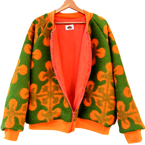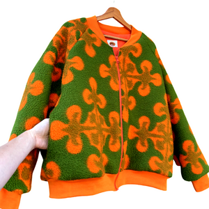 Deze prachtige jas is gemaakt van een vintage deken met een hele gave retro patroon. Hij valt ruim als een maat L.